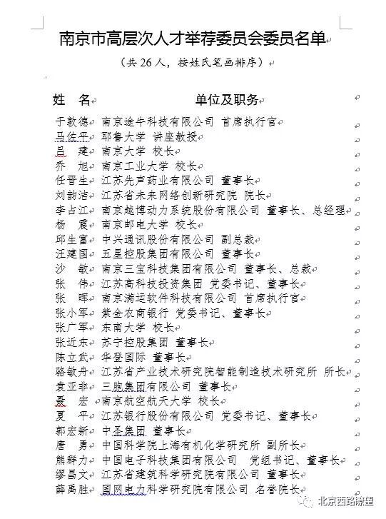 “北京西路瞭望”(微信号:xhrbbjxllw)查阅《南京市高层次人才举荐办法(试行)》发现,举荐委员会委员由世界500强等知名企业、新型研发机构、知名科技服务企业、知名金融投资机构负责人等企业界杰出人士和两院院士等学术泰斗担任,聘期2年,每名委员每年可提名举荐1-3名人才。