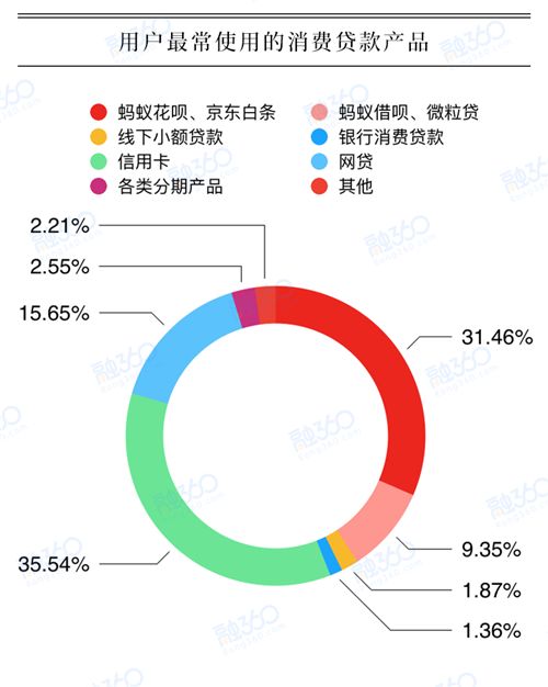 从数据上看,在用户最常使用的消费贷款产品中,信用卡以35.54%的比例占据首位,其次则是蚂蚁花呗、京东白条和网贷。