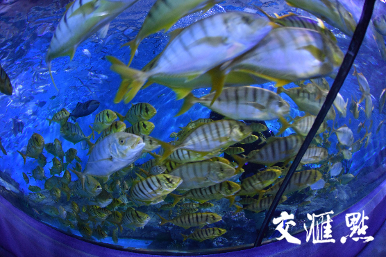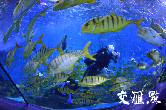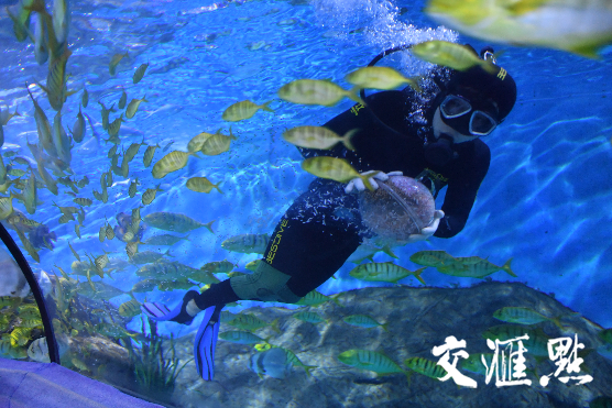 在海底世界的海底隧道内,身着童话礼服的潜水员将化作海洋舞者,在水中大秀黄金舞,400余只黄金鯵形成的鱼群搅动海水宛如一场“黄金风暴”,将潜水员团团围住,有节奏地变换着队形。