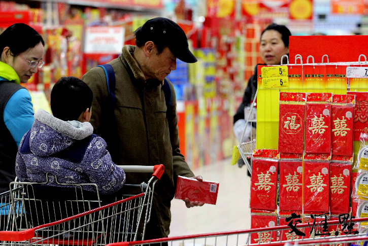 2月8日是农历小年,记者在南京应天大街的一大型超市内看到,来到喜庆饰品区挑选“福”字、选春联的市民络绎不绝,为迎接新年做准备。